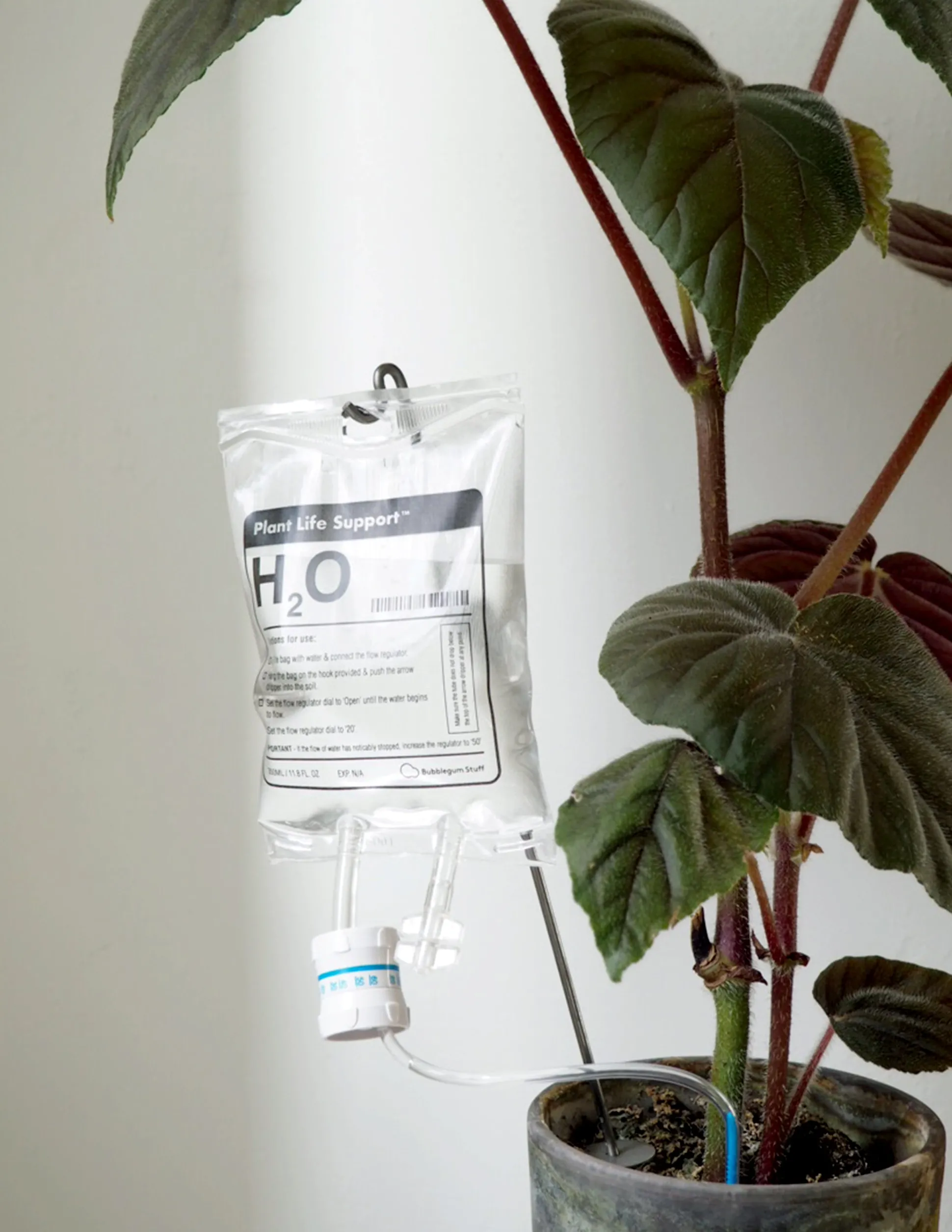 Selvvandende “Plant Life support” er anderledes måde at vande dine planter på. Med inspiration fra lægehjælpen kan du nu give dine planter det nødvendige vand (=H2O) via drop. På emballagen følger en vejledning med så du nemt kan komme igang med at bruge selvvandingen.
